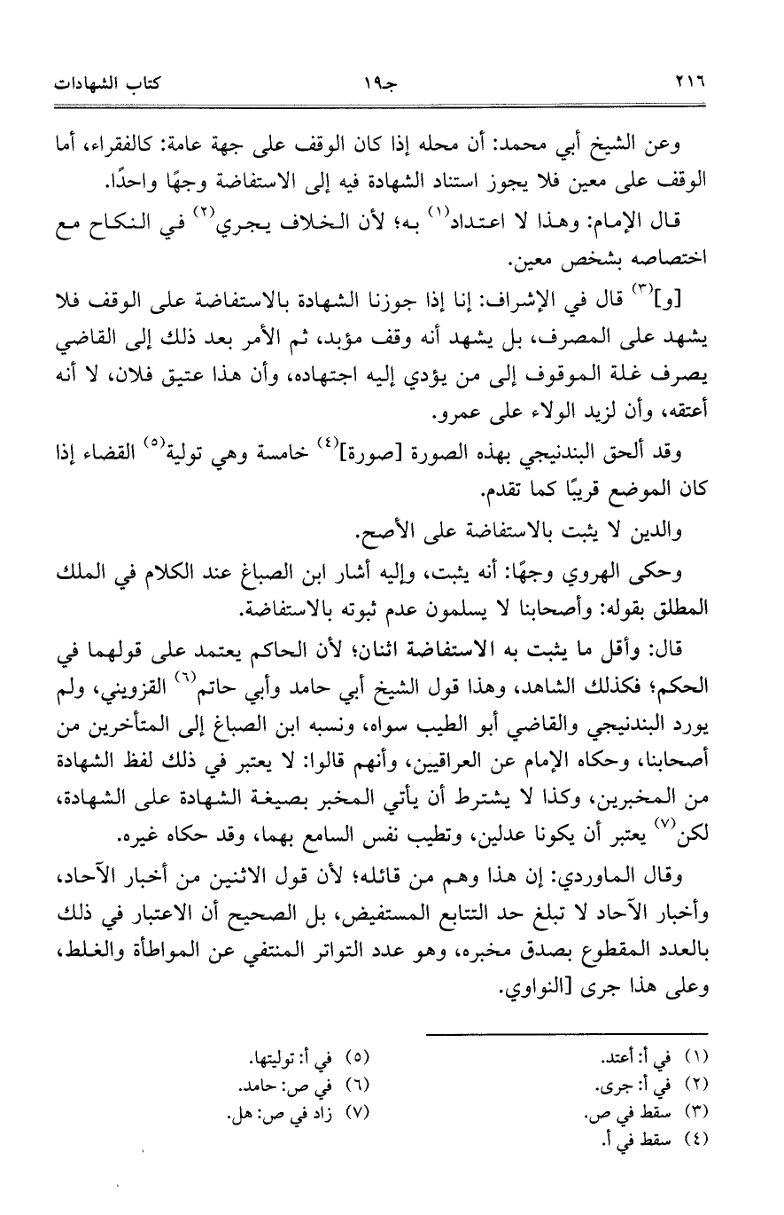وعن الشيخ أبي محمد: أن محله إذا كان الوقف على جهة عامة: كالفقراء، أما الوقف على معين فلا يجز استناد الشهادة فيه إلى الاستفاضة وجهًا واحدًا.