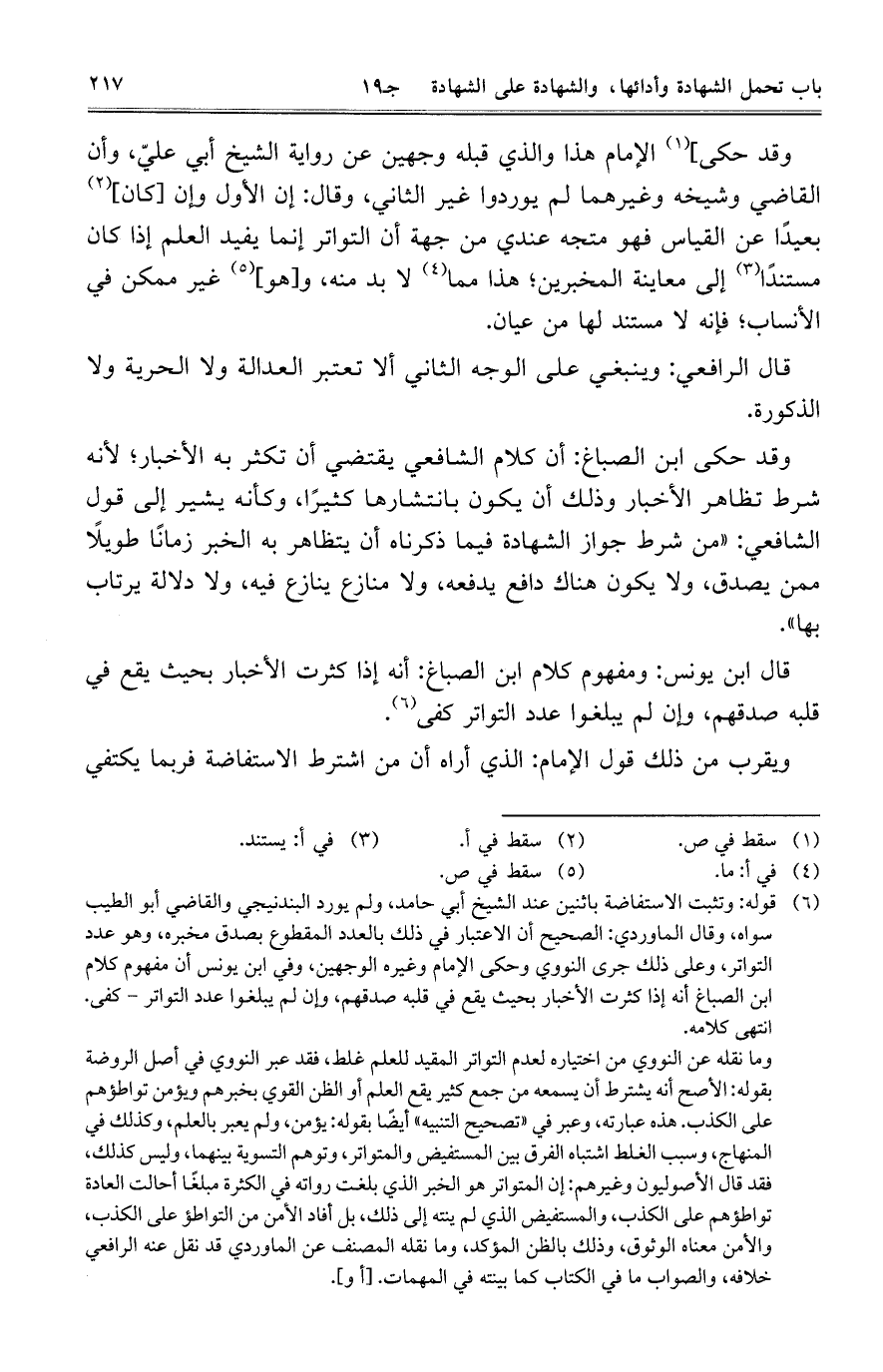 قال ابن يونس: ومفهوم كلام ابن الصباغ: أنه إذا كثرت الأخبار بحيث يقع في قلبه صدقهم، وإن لم يبلغوا عدد التواتر كفى.