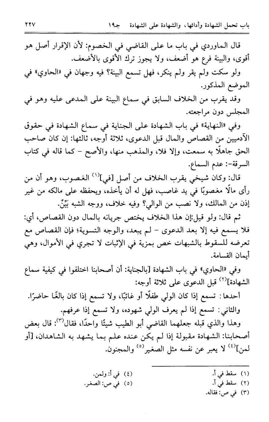 وفي ((الحاوي)) في باب الشهادة [بالجناية: أن أصحابنا اختلفوا في كيفية سماع الشهادة] قبل الدعوى على ثلاثة أوجه: