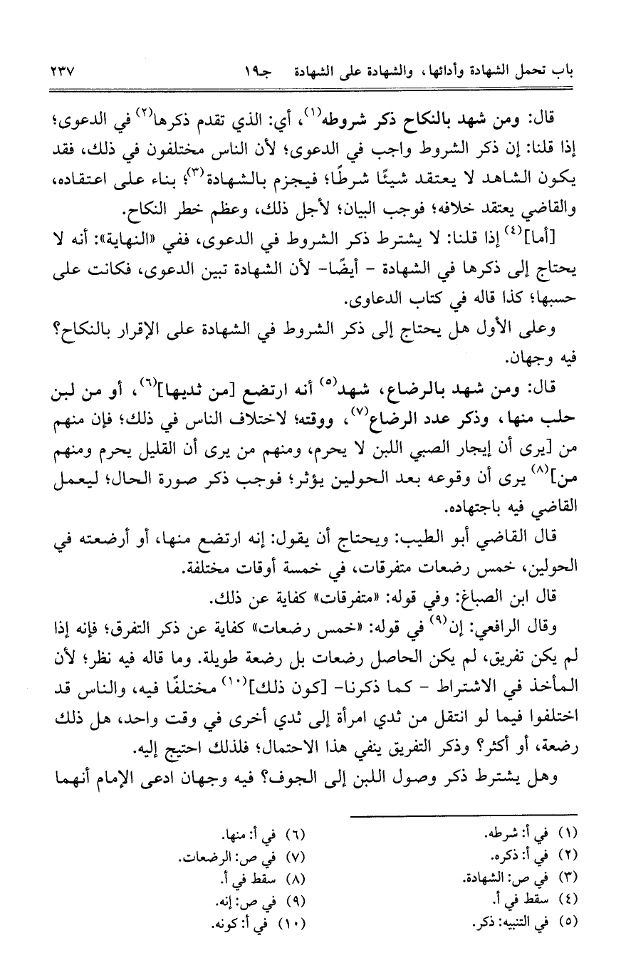 قال القاضي أبو الطيب: ويحتاج أن يقول: إنه ارتضع منها، أو أرضعته في الحولين، خمس رضعات متفرقات، في خمسة أوقات مختلفة.