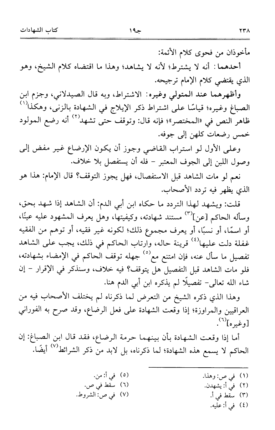 وأظهرهما عند المتولي وغيره: الاشتراط، وبه قال الصيدلاني، وجزم ابن الصباغ وغيره، قياسًا على اشتراط ذكر الإيلاج في الشهادة بالزنى، وهكذا ظاهر النص في ((المختصر))، فإنه قال: وتوقف حتى تشهد أنه رضع المولود خمس رضعات كلهن إلى جوفه.