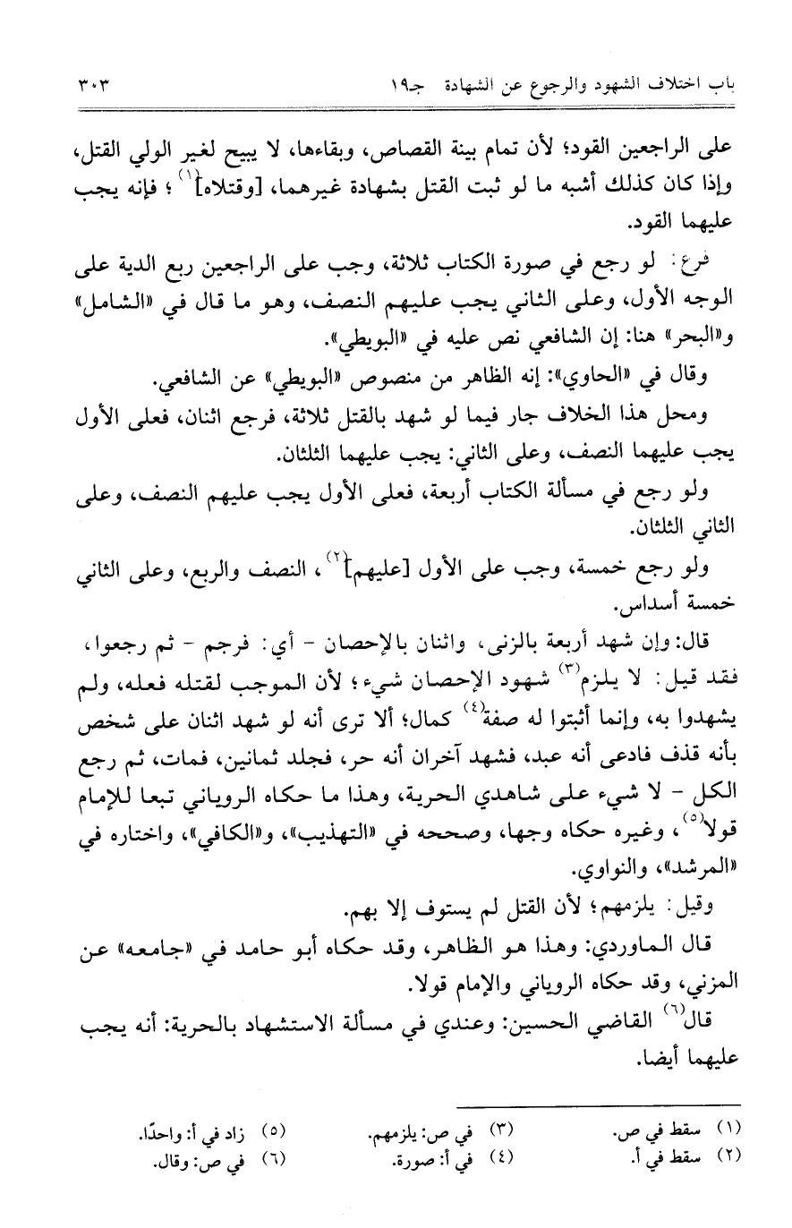 قال: وإن شهد أربعة بالزنى، واثنان بالإحصان- أي: فرجم- ثم رجعوا، فقد قيل: لا يلزم شهود الإحصان شيء، لأن الموجب لقتله فعله، ولم يشهدوا به، وإنما أثبتوا له صفة كمال، ألا ترى أنه لو شهد اثنان على شخص بأنه قذف فادعى أنه عبد، فشهد آخران أنه حر، فجلد ثمانين، فمات، ثم رجع الكل- لا شيء على شاهدي الحرية، وهذا ما حكاه الروياني تبعا للإمام قولا، وغيره حكاه وجها، وصححه في ((التهذيب)) و ((الكافي))، واختاره في ((المرشد))، والنواوي.