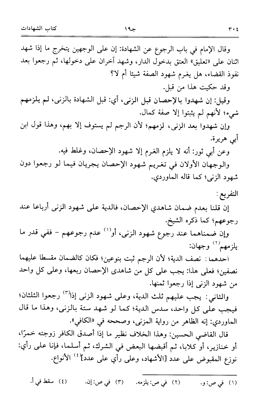 إن قلنا بعدم ضمان شاهدي الإحصان، فالدية على شهود الزنى أرباعًا عند رجوعهم، كما ذكره الشيخ.