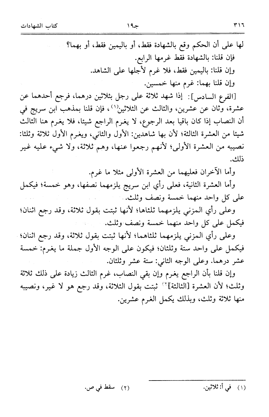 وإن قلنا بأن الراجع يغرم وإن بقي النصاب، غرم الثالث زيادة على ذلك ثلاثة وثلث، لأن العشرة [الثالثة] ثبتت بقول الثلاثة، وقد رجع هو لا غير، ونصيبه منها ثلاثة وثلث، وبذلك يكمل الغرم عشرين.