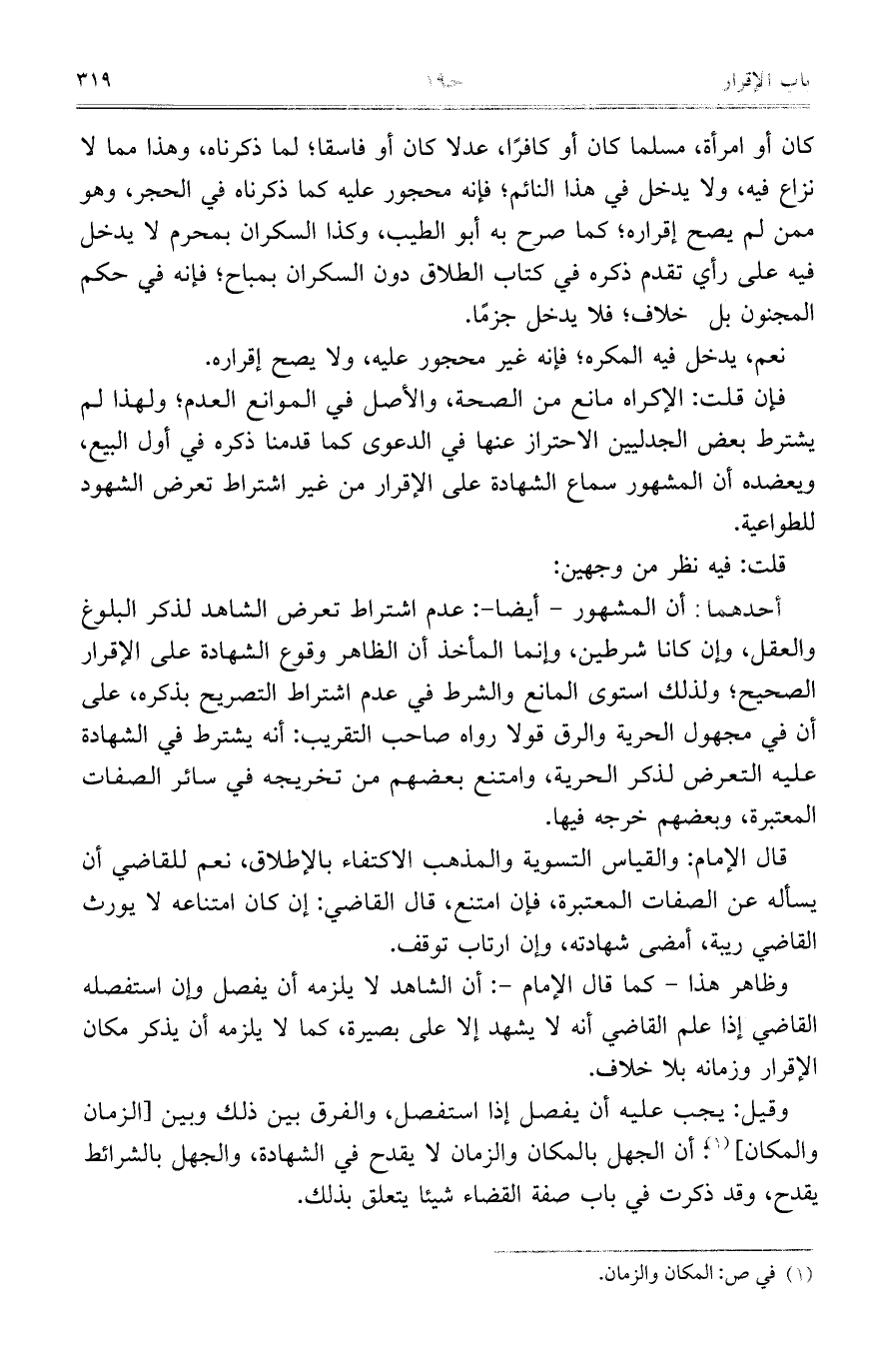 وقيل: يجب عليه أن يفصل إذا استفصل، والفرق بين ذلك وبين [الزمان والمكان]. أن الجهل بالمكان والزمان لا يقدح في الشهادة، والجهل بالشرائط يقدح، وقد ذكرت في باب صفة القضاء شيئًا يتعلق بذلك.