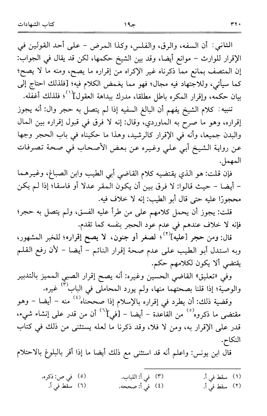 الثاني: أن السفه، والرق، والفلس، وكذا المرض- على أحد القولين في الإقرار للوارث- موانع أيضًا، وقد بين الشيخ حكمها، لكن قد يقال في الجواب: إن المتصف بمانع مما ذكرناه غير الإكراه من إقراره ما يصح، ومنه ما لا يصح، كما سيأتي، وللاجتهاد فيه مجال، فهو مما يغمض الكلام فيه، [فلذلك احتاج إلى بيان حكمه، وإقرار المكره باطل مطلقًا، مدرك ببداهة العقول]، فلذلك أغفله.