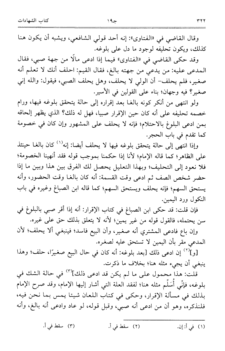 قلت: هذا محمول على ما لم يكن قد ادعى ذلك] في حالة الشك في بلوغه، فأني أسلم مثله هنا، لفقد العلة التي أشار إليها الإمام، وقد صرح الإمام بذلك في مسالة الإقرار، وحكى في كتاب اللعان شيئًا يمس بما نحن فيه، فلنذكره، وهو أن من ادعى أنه صبي، وقبل قوله، لو عاد وادعى أنه بالغ، وأنه