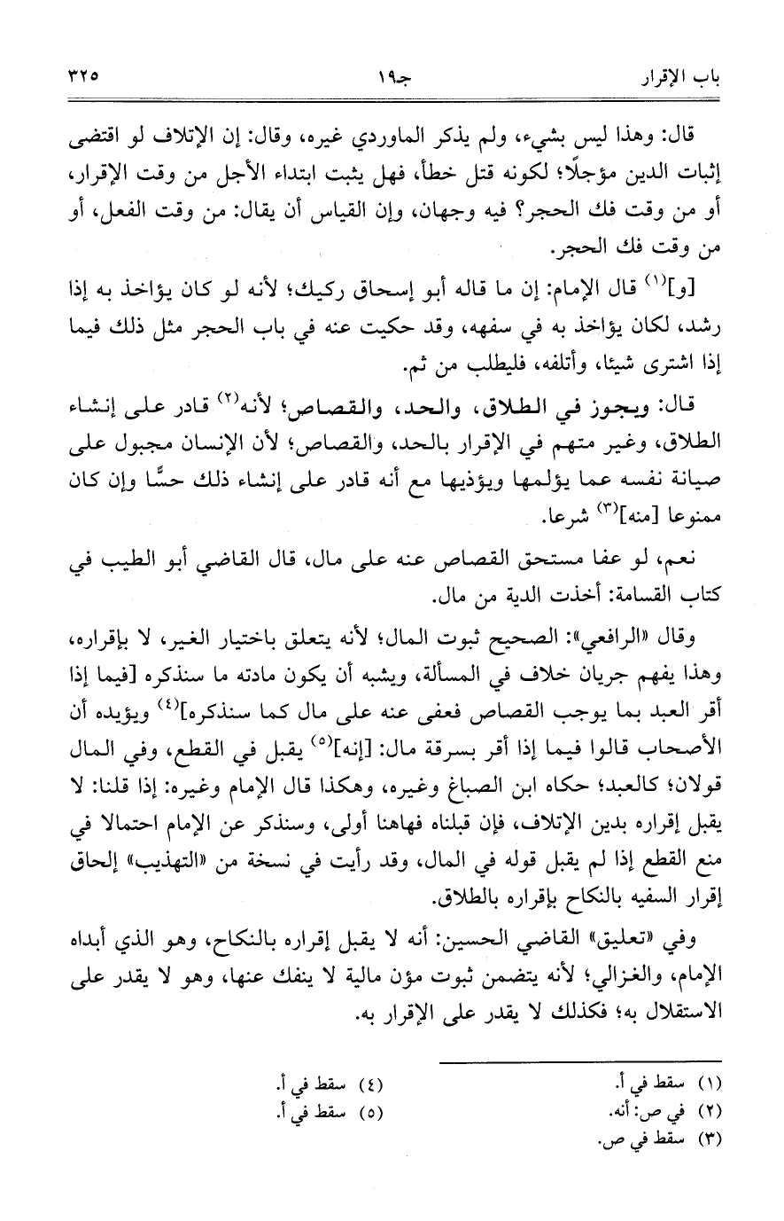 وقال ((الرافعي)): الصحيح ثبوت المال، لأنه يتعلق باختيار الغير، لا بإقراره، وهذا يفهم جريان خلاف في المسألة، ويشبه أن يكون مادته ما سنذكره [فيما إذا أقر العبد بما يوجب القصاص فعفى عنه على مال كما سنذكره] ويؤيده أن الأصحاب قالوا فيما إذا أقر بسرقة مال: [إنه] يقبل في القطع، وفي المال قولان، كالعبد، حكاه ابن الصباغ وغيره، وهكذا قال الإمام وغيره: إذا قلنا: لا يقبل إقراره بدين الإتلاف، فإن قبلناه فهاهنا أولى، وسنذكر عن الإمام احتمالًا في منع القطع إذا لم يقبل قوله في المال، وقد رأيت في نسخة من ((التهذيب)) إلحاق إقرار السفيه بالنكاح بإقراره بالطلاق.