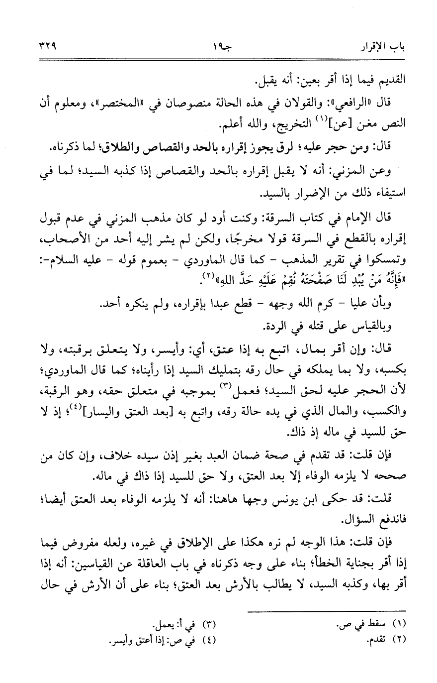 قال الإمام في كتاب السرقة: وكنت أود لو كان مذهب المزني في عدم قبول إقراره بالقطع في السرقة قولًا بالقطع في السرقة قولًا مخرجًا، ولكن لم يشر إليه أحد من الأصحاب، وتمسكوا في تقرير المذهب- كما قال الماوردي- بعموم قوله- عليه السلام-: ((فَإِنَّهُ مَنْ بُيْدِ لَنَا صَفْحَتَهُ نُقِمْ عَلَيْهِ حَدَّ اللهِ)).
