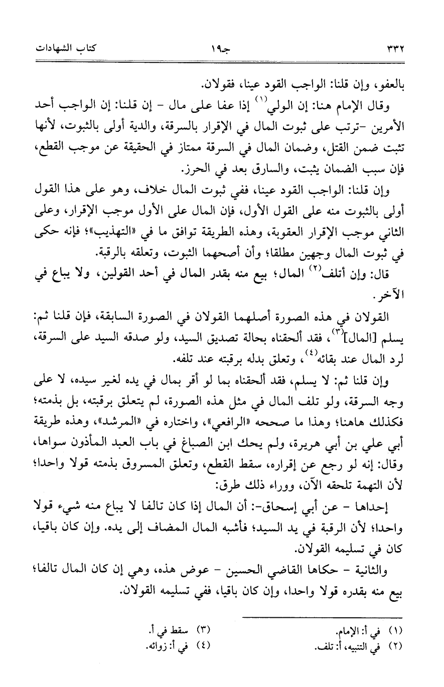 وقال الإمام هنا: إن الولي إذا عفا على مال- إن قلنا: إن الواجب أحد الأمرين- ترتب على ثبوت المال في الإقرار بالسرقة، والدية أولى بالثبوت، لأنها تثبت ضمن القتل، وضمان المال في السرقة ممتاز في الحقيقة عن موجب القطع، فإن سبب الضمان يثبت، والساق بعد في الحرز.