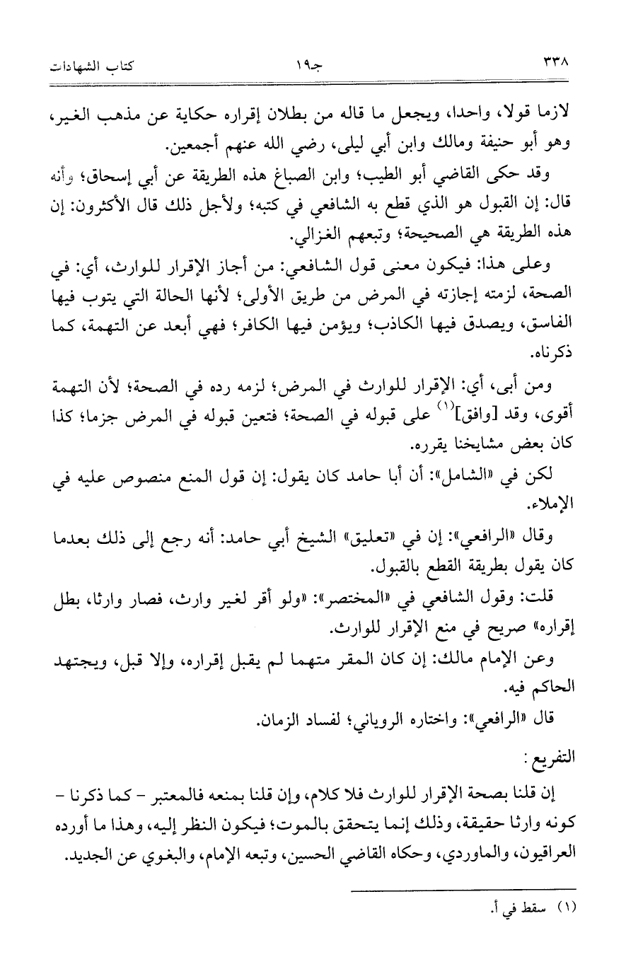 لازمًا قولًا، واحدًا، ويجعل ما قاله من بطلان إقراره حكاية عن مذهب الغير، وه أبو حنيفة ومالك وابن أبي ليلى، رضي الله عنهم أجمعين.