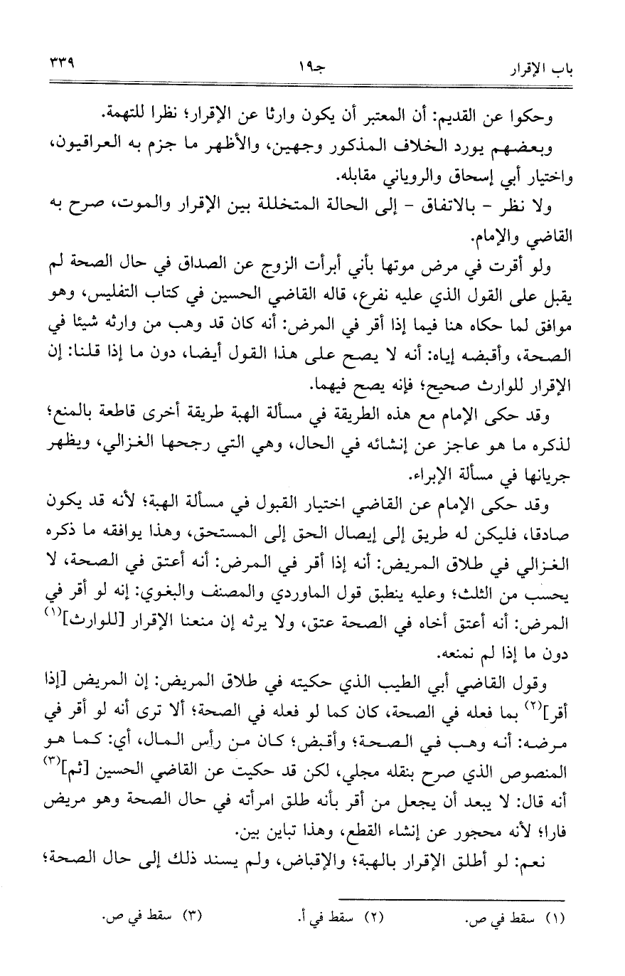 وقول القاضي أبي الطيب الذي حكيته في طلاق المريض: إن المريض [إذا أقر] بما فعله في الصحة، كان كما لو فعله في الصحة، ألا ترى أنه لو أقر في مرضه: أنه وهب في الصحة، وأقبض، كان من رأس المال، أي: كما هو المنصوص الذي صرح بنقله مجلي، لكن قد حكيت عن القاضي الحسين [ثم] أنه قال: لا يبعد أن يجعل من أقر بأنه طلق امرأته في حال الصحة وهو مريض فارًا، لأنه محجور عن إنشاء القطع، وهذا تباين بين.