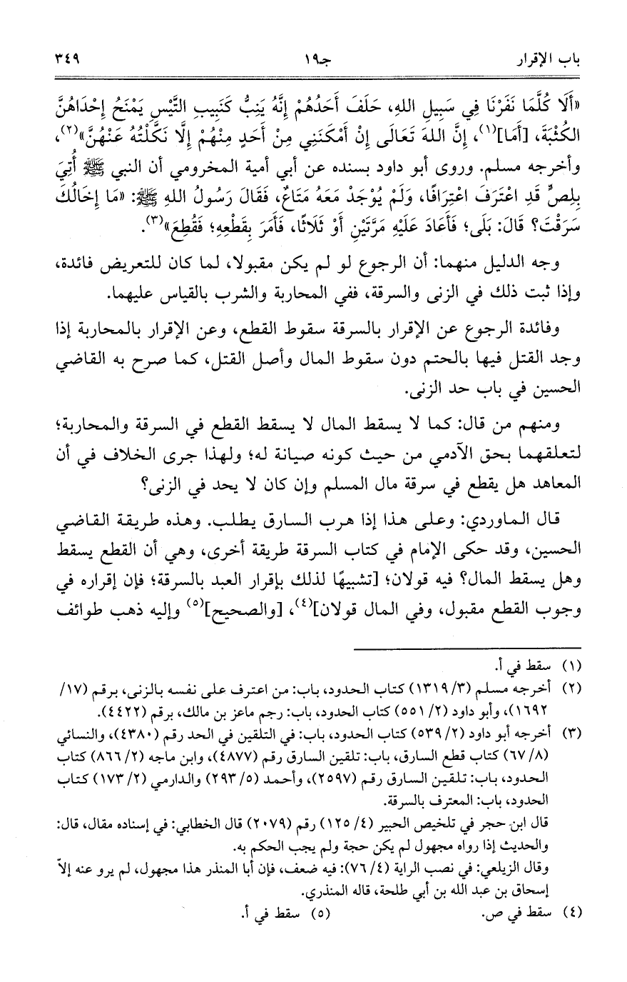 ((ألا كلما نفرنا في سبيل الله، حلف أحدهم إنه ينب كنبيب التيس يمنح إحداهن الكثبة، [أما]، إن الله تعالى إن أمكنني من أحدٍ منهم إلا نكلته عنهن))، وأخرجه مسلم. وروى أبو داود بسنده عن أبي أمية المخرومي أن النبي صلّى الله عليه وسلّم أتي بلص قد اعترف اعترافًا، ولم يوجد معه متاعٌ، فقال رسول الله صلّى الله عليه وسلّم: ((ما إخالك سرقت؟ قال: بلى، فأعاد عليه مرتين أو ثلاثًا، فأمر بقطعه، فقطع)).
