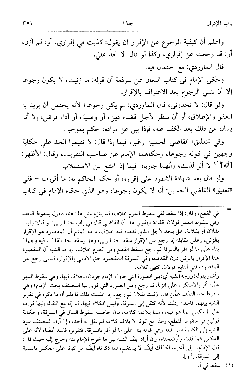 وحكى الإمام في كتاب اللعان عن شرذمة أن قوله: ما زنيت، لا يكون رجوعًا إلا أن ينبني الرجوع بعد الاعتراف بالإقرار.