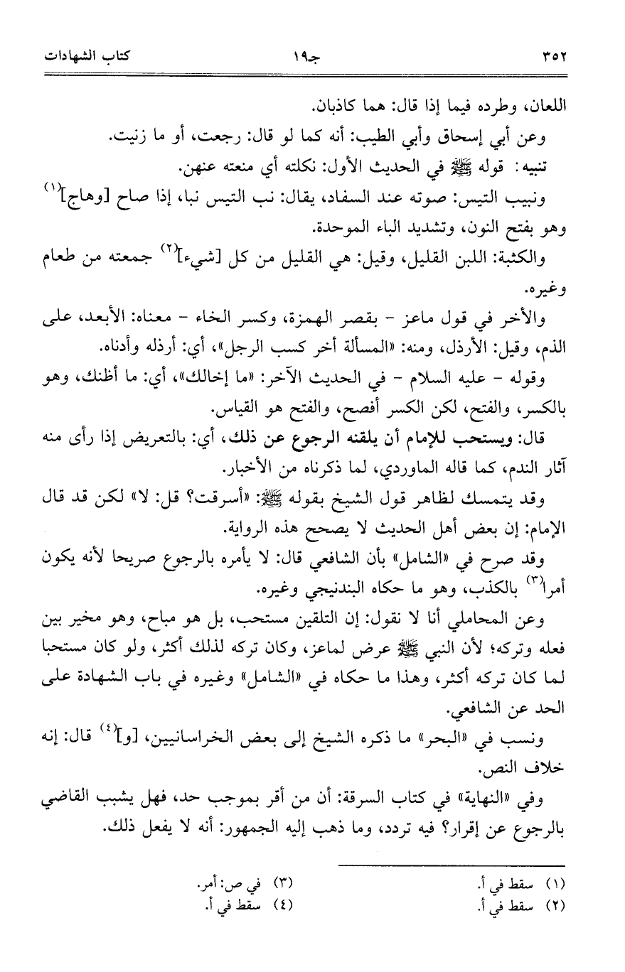 وفي ((النهاية)) في كتاب السرقة: أن من أقر بموجب حد، فهل يشبب القاضي بالرجوع عن إقرار؟ فيه تردد، وما ذهب إليه الجمهور: أنه لا يفعل ذلك.