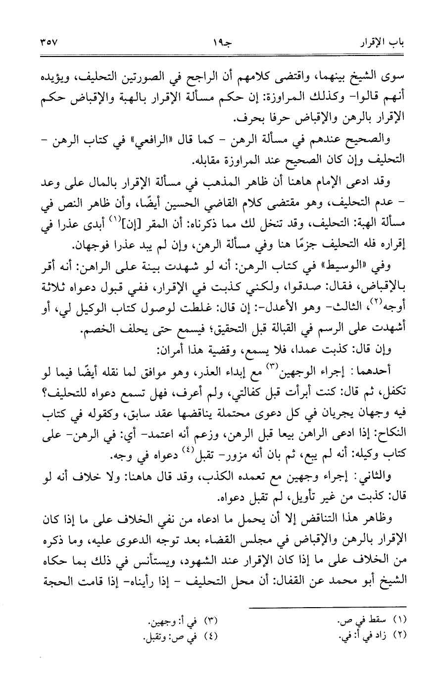 وقد ادعى الإمام هاهنا أن ظاهر المذهب في مسألة الإقرار بالمال على وعد- عدم التحليف، وهو مقتضى كلام القاضي الحسين أيضًا، وأن ظاهر النص في مسألة الهبة: التحليف، وقد تنخل لك مما ذكرناه: أن المقر [إن] أبدى عذرًا في إقراره فله التحليف جزمًا هنا وفي مسألة الرهن، وإن لم يبد عذرًا فوجهان.