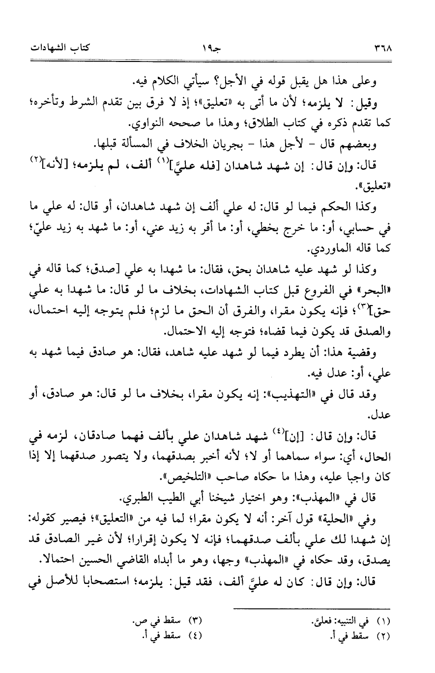 وكذا الحكم فيما لو قال: له علي ألف إن شهد شاهدان، أو قال: له علي ما في حسابي، أو: ما خرج بخطي، أو: ما أقر به زيد عني، أو: ما شهد به زيد علي، كما قاله الماوردي.