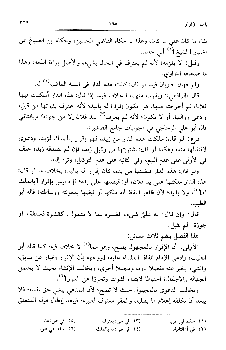 الأولى: أن الإقرار بالمجهول يصح، وهو مما لا خلاف فيه، كما قاله أبو الطيب، وادعى الإمام اتفاق العلماء عليه، [ووجهه بأن الإقرار إخبار عن سابق، والشيء يخبر عنه مفصلًا تارة، ومجملًا أخرى، ويخالف الإنشاء بحيث لا يحتمل الجهالة والإجمال، احتياطًا لابتداء الثبوت وتحرزًا عن الغرر].