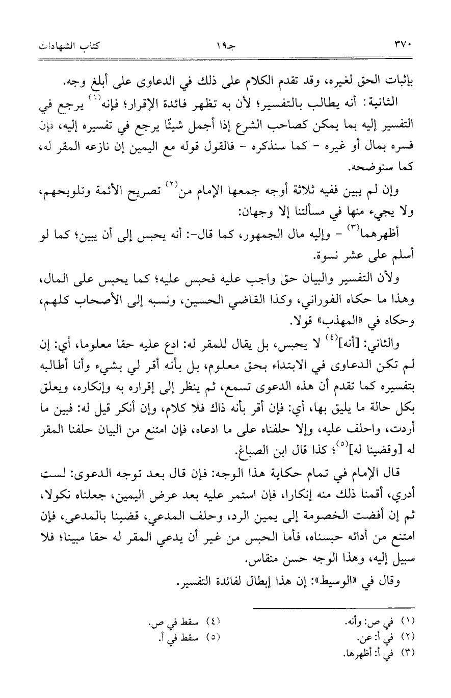 ولأن التفسير والبيان حق واجب عليه فحبس عليه، كما يحبس على المال، وهذا ما حكاه الفوراني، وكذا القاضي الحسين، ونسبه إلى الأصحاب كلهم، وحكاه في ((المهذب)) قولًا.
