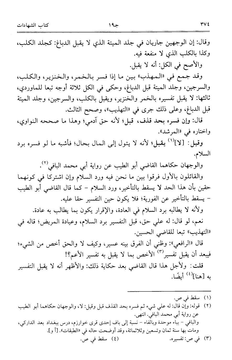 وقد جمع في ((المهذب)) بين ما إذا فسر بالخمر، والخنزير، والكلب، والسرجين، وجلد الميتة قبل الدباغ، وحكى في الكل ثلاثة أوجه تبعًا للماوردي، ثالثها: لا يقبل تفسيره بالخمر والخنزير، ويقبل بالكلب، والسرجين، وجلد الميتة قبل الدباغ، وعلى ذلك جرى في ((التهذيب))، وصحح الثالث.