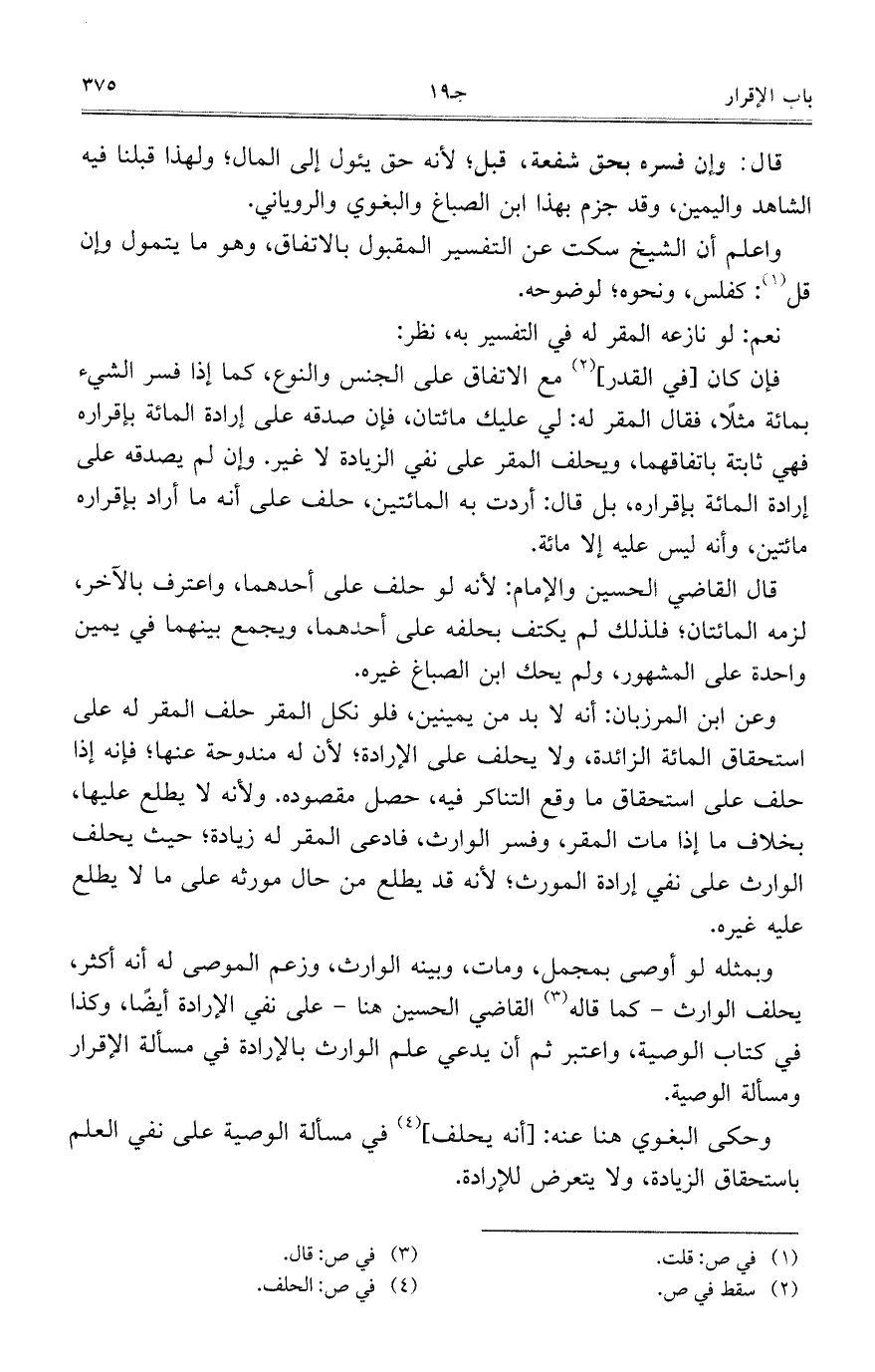 وبمثله لو أوصى بمجمل، ومات، وبينه الوارث، وزعم الموصى له أنه أكثر، يحلف الوارث- كما قاله القاضي الحسين هنا- على نفي الإرادة أيضًا، وكذا في كتاب الوصية، واعتبر ثم أن يدعي علم الوارث بالإرادة في مسألة الإقرار ومسألة الوصية.