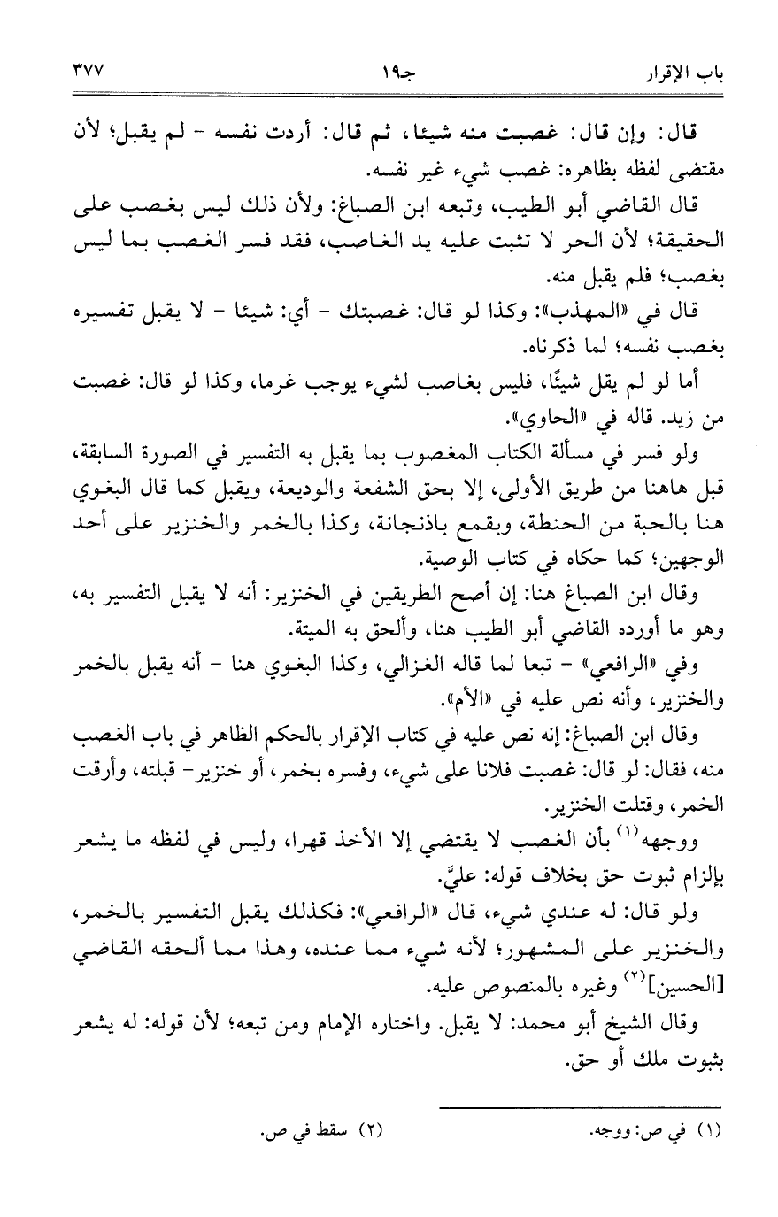 وقال ابن الصباغ: إنه نص في كتاب الإقرار بالحكم الظاهر في باب الغصب منه، فقال: لو قال: غصبت فلانًا على شيء، وفسره بخمر، أو خنزير- قبلته، وأرقت الخمر، وقتلت الخنزير.