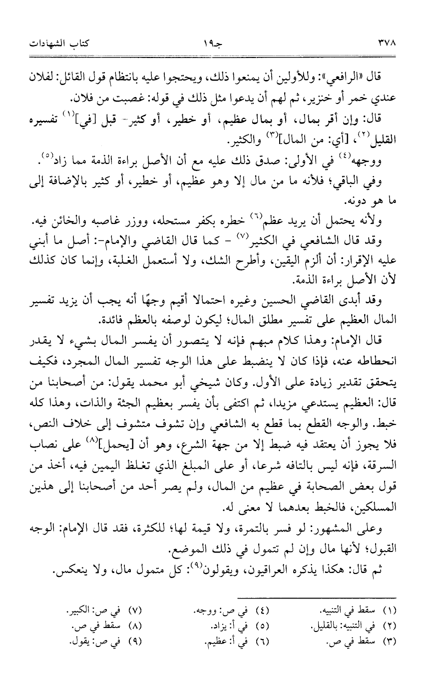 قال الإمام: وهذا كلام مبهم فإنه لا يتصور أن يفسر المال بشيء لا يقدر انحطاطه عنه، فإذا كان لا ينضبط على هذا الوجه تفسير المال المجرد، فكيف يتحقق تقدير زيادة على الأول. وكان شيخي أبو محمد يقول: من أصحابنا من قال: العظيم يستدعي مزيدًا، ثم اكتفى بأن يفسر بعظيم الجثة والذات، وهذا كله خبط. والوجه القطع بما قطع به الشافعي وإن تشوف متشوف إلى خلاف النص، فلا يجوز أن يعتقد فيه ضبط إلا من جهة الشرع، وهو أن [يحمل] على نصاب السرقة، فإنه ليس بالتافه شرعًا، أو على المبلغ الذي تغلظ اليمين فيه، أخذ من قول بعض الصحابة في عظيم من المال، ولم يصر أحد من أصحابنا إلى هذين المسلكين، فالخبط بعدهما لا معنى له.