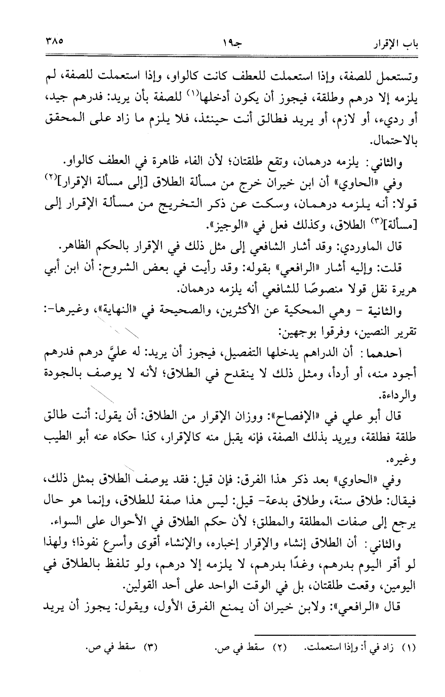 وتستعمل للصفة، وإذا استعملت للعطف كانت كالواو، وإذا استعملت للصفة، لم يلزمه إلا درهم وطلقة، فيجوز أن يكون أدخلها للصفة بأن يريد: فدرهم جيد، أو رديء، أو لازم، أو يريد فطالق أنت حينئذ، فلا يلزم ما زاد على المحقق بالاحتمال.