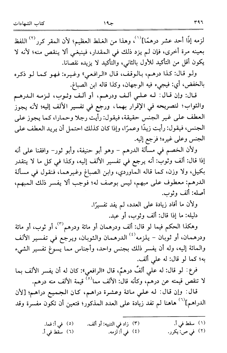 لزمه إذًا أحد عشر درهمًا]، وهذا من الغلط العظيم، لأن المقر كرر اللفظ بعينه مرة أخرى، فإن لم يزد ذلك في المقدار، فينبغي ألا ينقص منه، لأنه لا يكون أقل من التأكيد للأول بالثاني، والتأكيد لا يزيده نقصانًا.