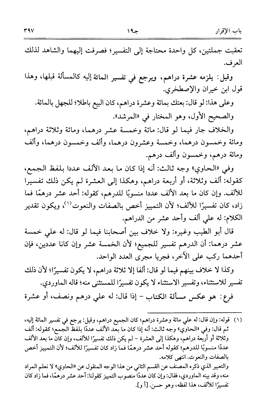 وفي ((الحاوي)) وجه ثالث: أنه إذا كان ما بعد الألف عددًا بلفظ الجمع، كقوله: ألف وثلاثة، أو أربعة دراهم، وهكذا إلى العشرة لم يكن ذلك تفسيرًا للألف. وإن كان ما بعد الألف عددًا منسوبًا للدرهم، كقوله: أحد عشر درهمًا فما زاد، كان تفسيرًا للألف، لأن التمييز أخص بالصفات والنعوت، ويكون تقدير الكلام: له علي ألف وأحد عشر من الدراهم.