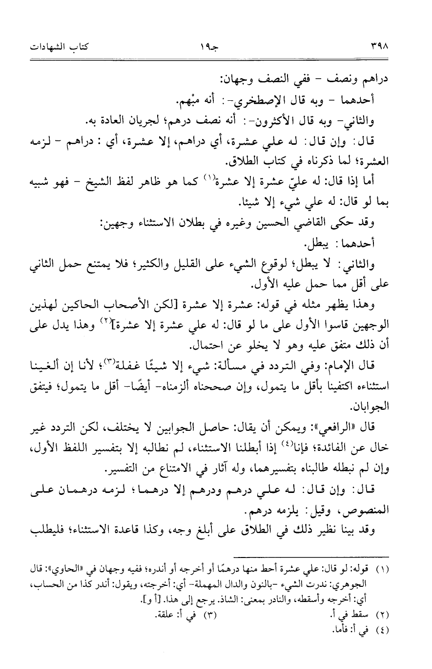 قال الإمام: وفي التردد في مسالة: شيء إلا شيئًا غفلة، لأنا إن ألغينا استثناءه اكتفينا بأقل ما يتمول، وإن صححناه ألزمناه- أيضًا- أقل ما يتمول، فيتفق الجوابان.