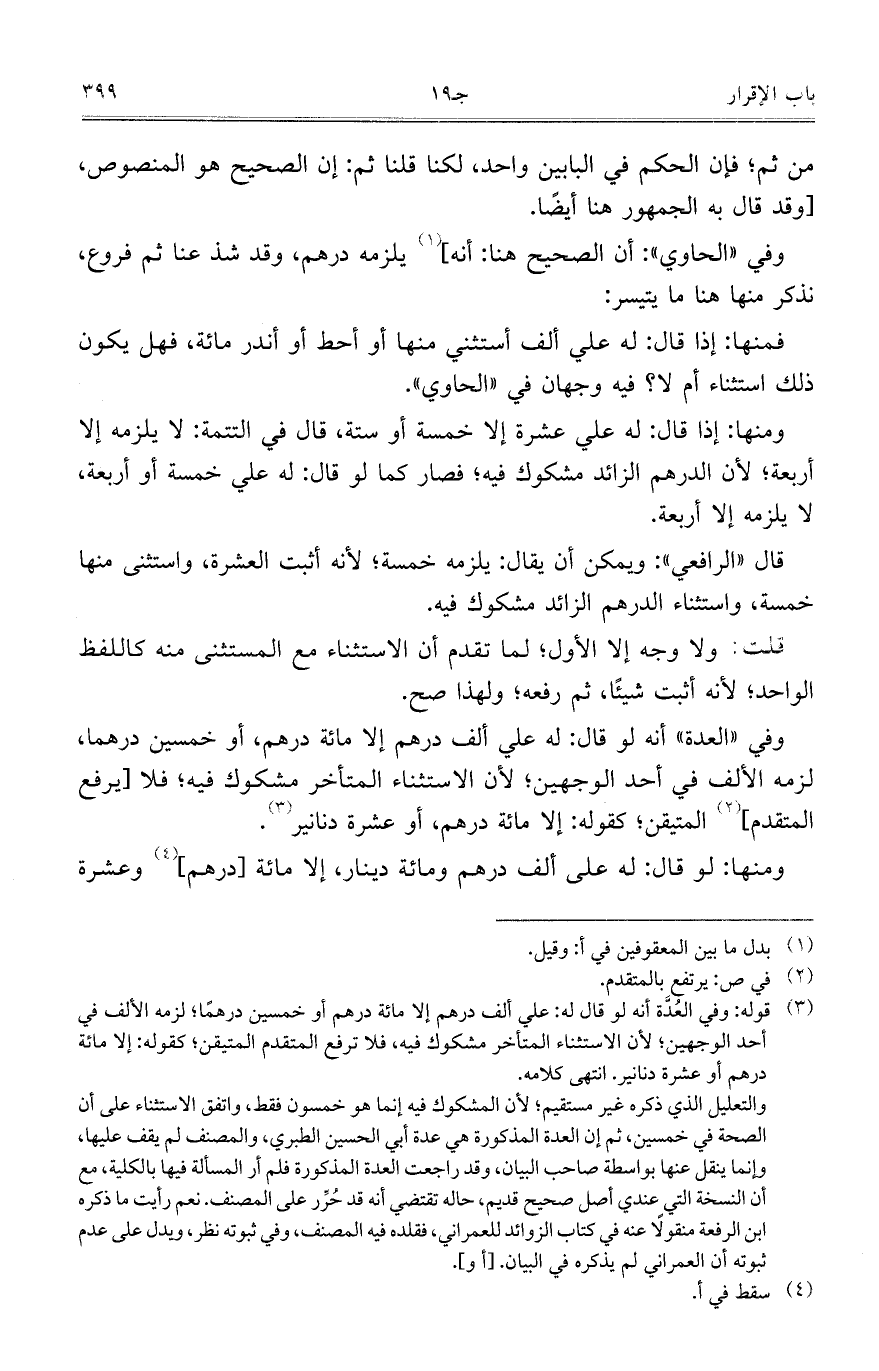 وفي ((العدة)) أنه لو قال: له علي ألف درهم إلا مائة درهم، أو خمسين درهمًا، لزمه الألف في أحد الوجهين، لأن الاستثناء المتأخر مشكوك فيه، فلا [يرفع المتقدم] المتيقن، كقوله: إلا مائة درهم، أو عشرة دنانير.