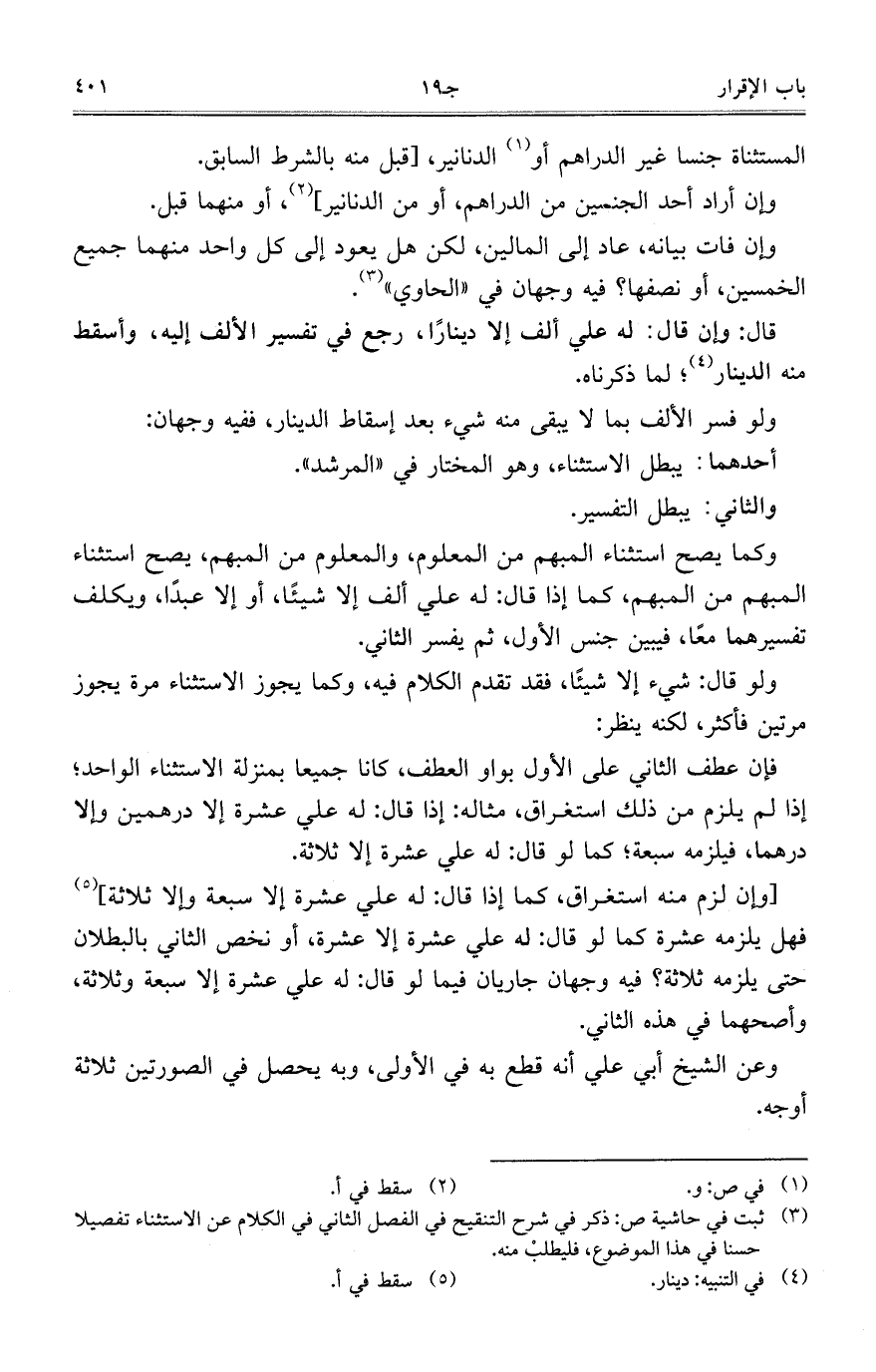 وكما يصح استثناء المبهم من المعلوم، والمعلوم من المبهم، يصح استثناء المبهم من المبهم، كما إذا قال: له علي ألف إلا شيئًا، أو إلا عبدًا، ويكلف تفسيرهما معًا، فيبين جنس الأول، ثم يفسر الثاني.