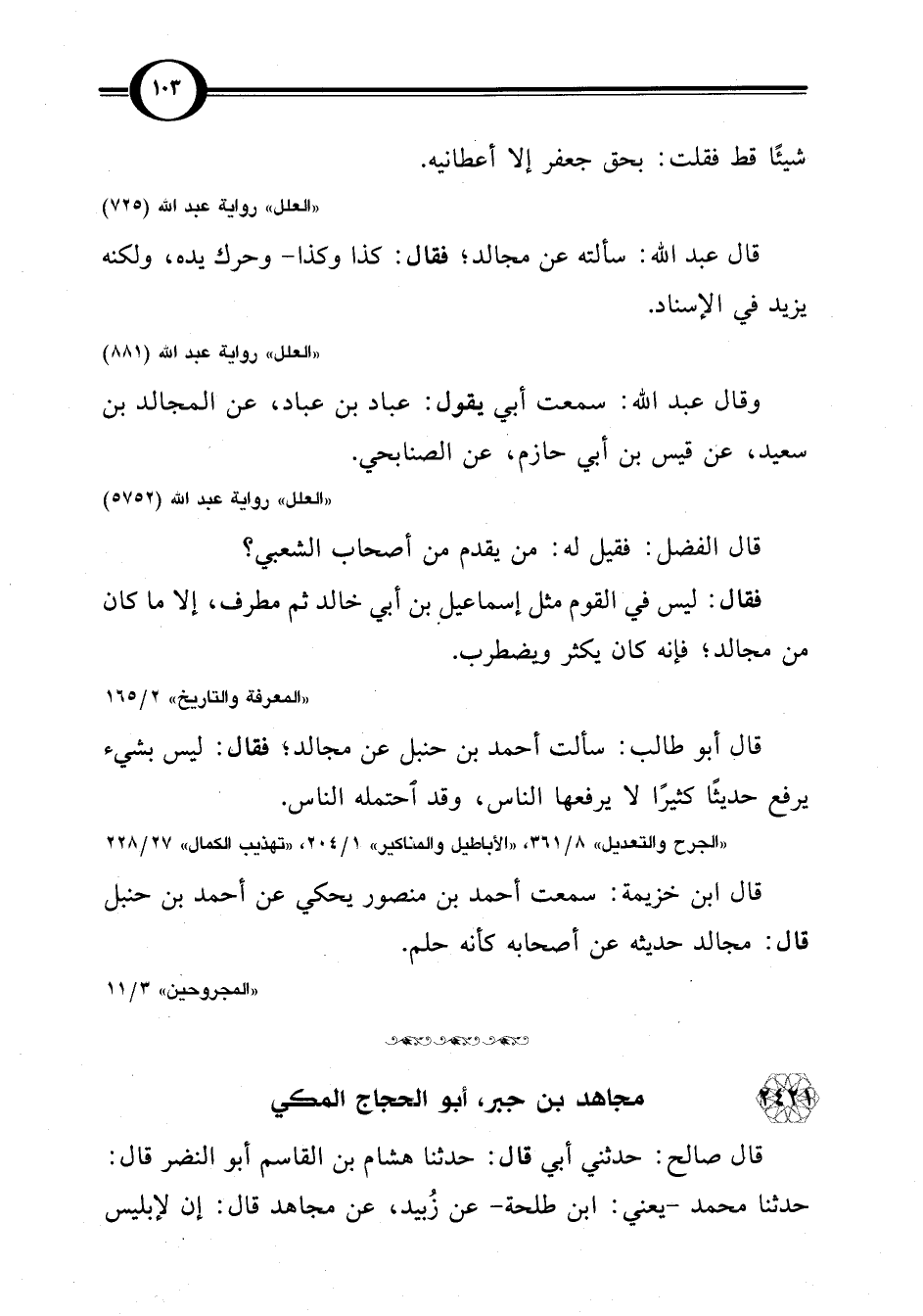 وقال عبد اللَّه: سمعت أبي يقول: عباد بن عباد، عن المجالد بن سعيد، عن قيس بن أبي حازم، عن الصنابحي.