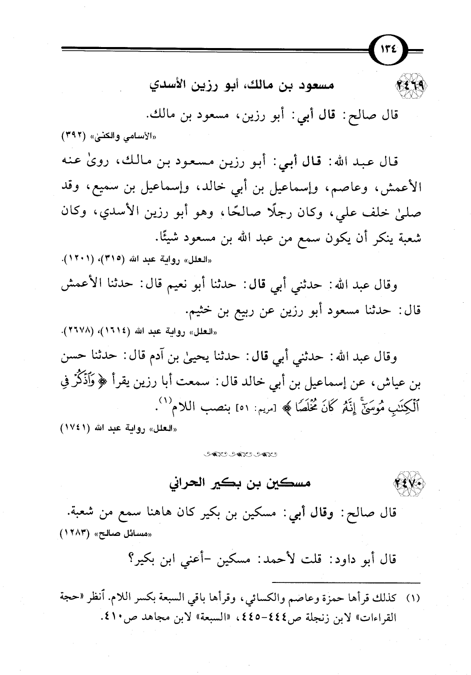 وقال عبد اللَّه: حدثني أبي قال: حدثنا يحيى بن آدم قال: حدثنا حسن بن عياش، عن إسماعيل بن أبي خالد قال: سمعت أبا رزين يقرأ {وَاذْكُرْ فِي الْكِتَابِ مُوسَى إِنَّهُ كَانَ مُخْلَصًا} [مريم: 51] بنصب اللام (¬1).