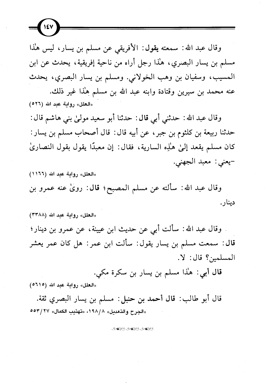 وقال عبد اللَّه: سمعته يقول: الأفريقي عن مسلم بن يسار، ليس هذا مسلم بن يسار البصري، هذا رجل أراه من ناحية إفريقية، يحدث عن ابن المسيب، وسفيان بن وهب الخولاني. ومسلم بن يسار البصري، يحدث عنه محمد بن سيرين وقتادة وابنه عبد اللَّه بن مسلم هذا غير ذلك.