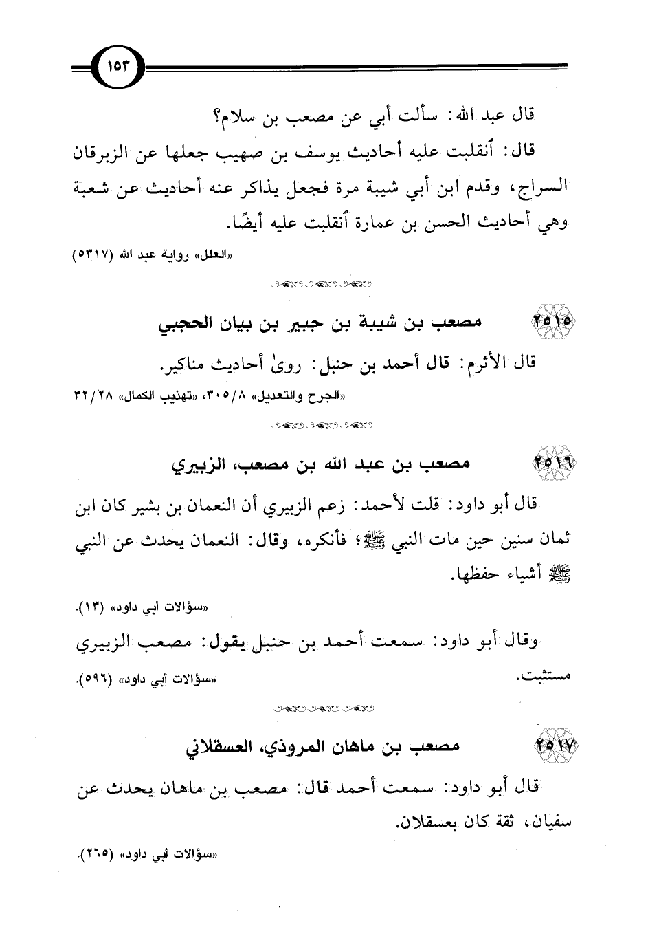وقال أبو داود: سمعت أحمد بن حنبل يقول: مصعب الزبيري مستثبت.