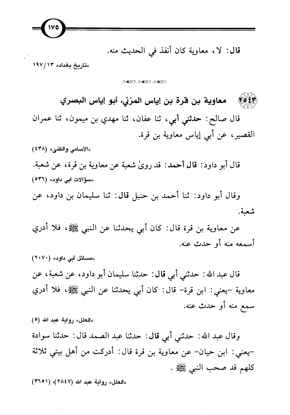 قال صالح: حدثني أبي، ثنا عفان، ثنا مهدي بن ميمون، ثنا عمران القصير، عن أبي إياس معاوية بن قرة.