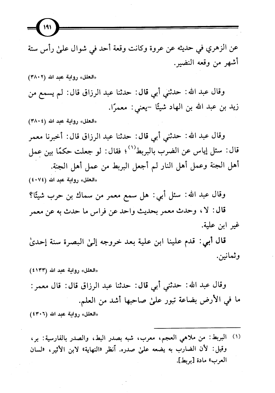 وقال عبد اللَّه: حدثني أبي قال: حدثنا عبد الرزاق قال: لم يسمع من زيد بن عبد اللَّه بن الهاد شيئًا -يعني: معمرًا.