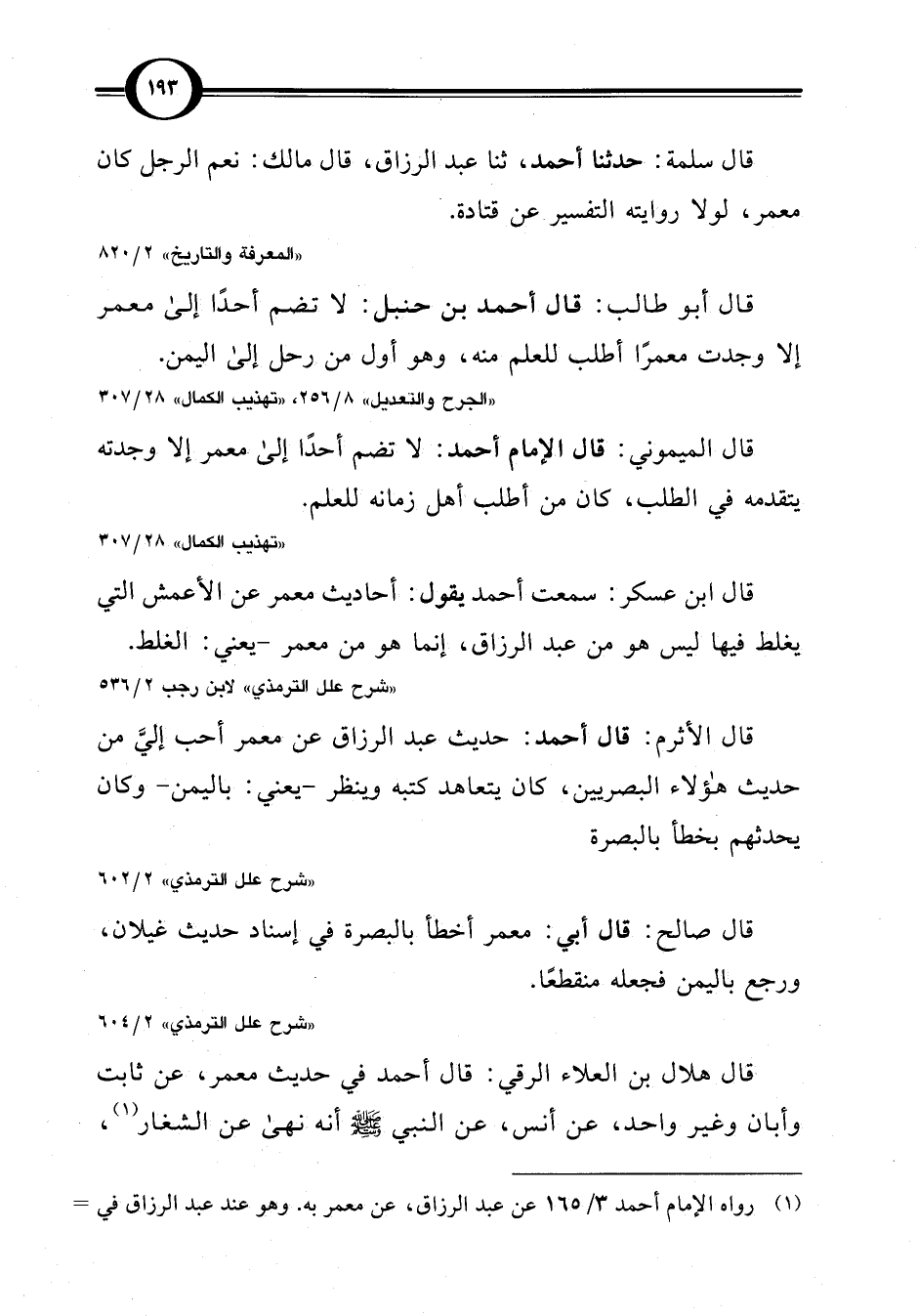 قال أبو طالب: قال أحمد بن حنبل: لا تضم أحدًا إلى معمر إلا وجدت معمرًا أطلب للعلم منه، وهو أول من رحل إلى اليمن.