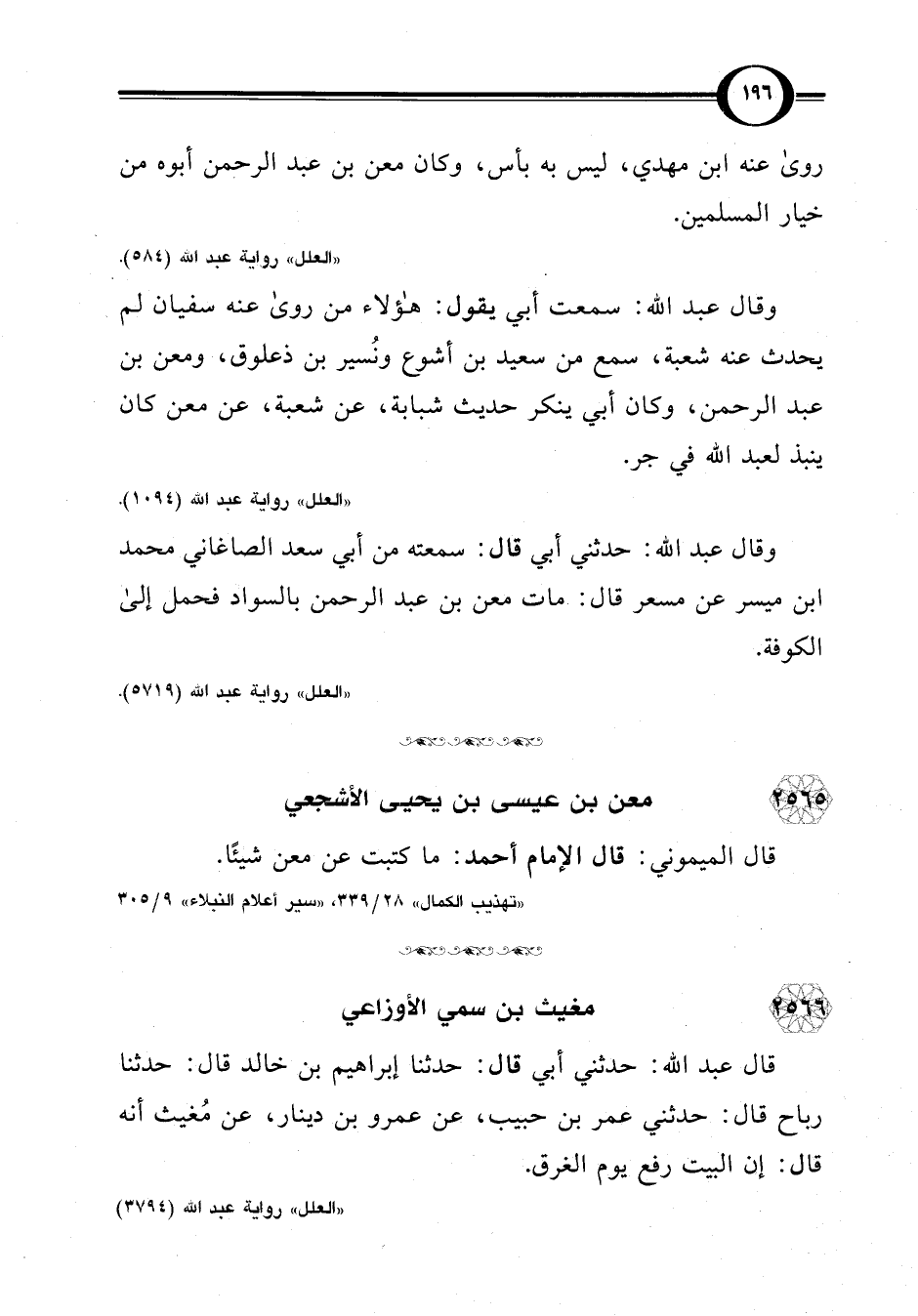 وقال عبد اللَّه: سمعت أبي يقول: هؤلاء من روى عنه سفيان لم يحدث عنه شعبة، سمع من سعيد بن أشوع ونُسير بن ذعلوق، ومعن بن عبد الرحمن، وكان أبي ينكر حديث شبابة، عن شعبة، عن معن كان ينبذ لعبد اللَّه في جر.