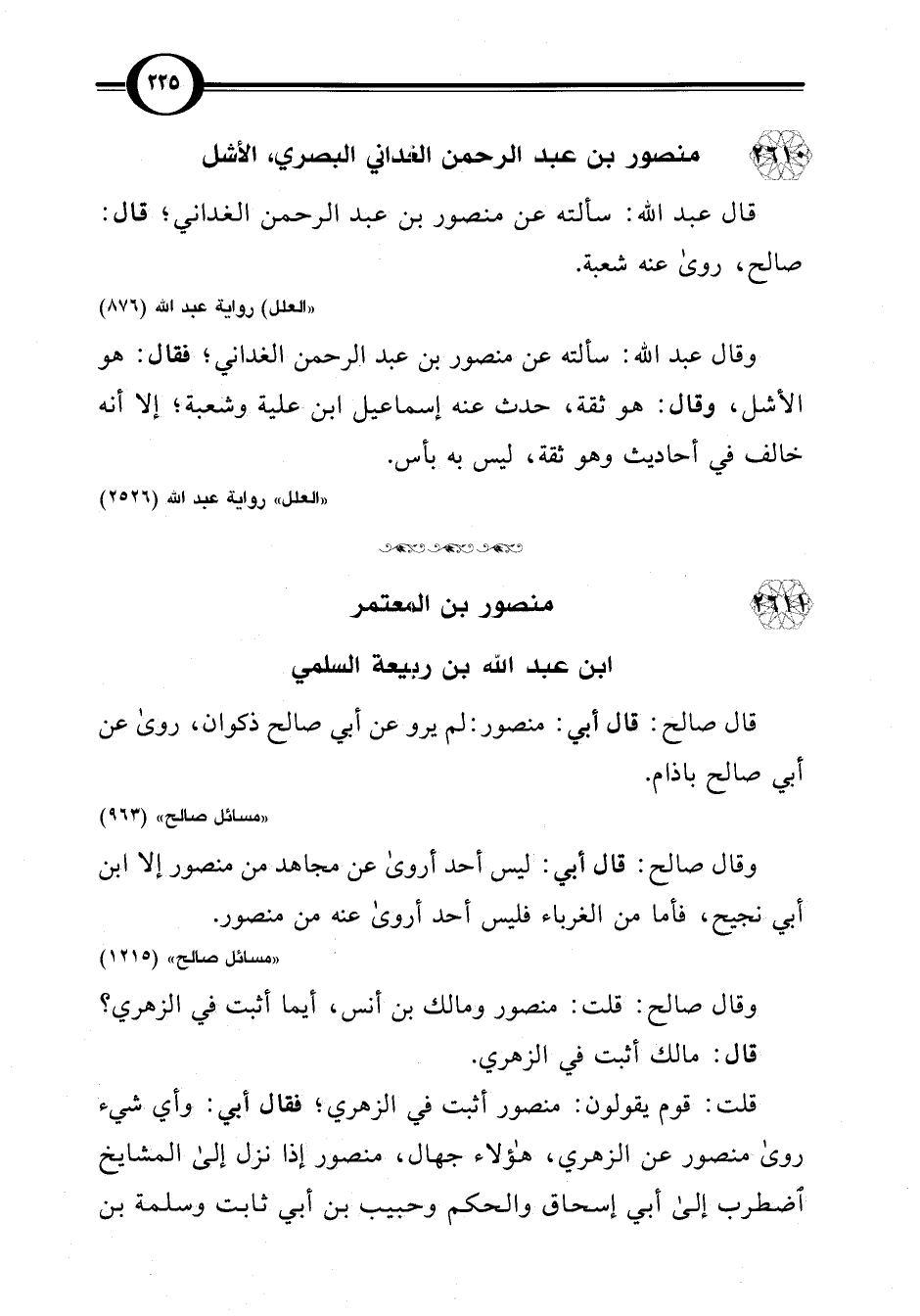 قال عبد اللَّه: سألته عن منصور بن عبد الرحمن الغداني؛ قال: صالح، روى عنه شعبة.