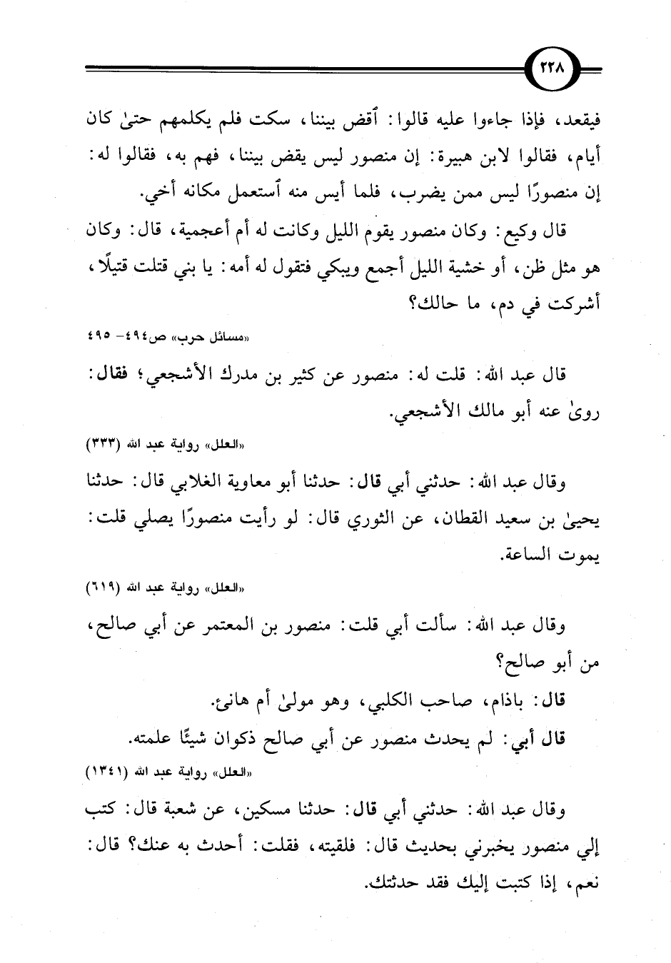 وقال عبد اللَّه: حدثني أبي قال: حدثنا أبو معاوية الغلابي قال: حدثنا يحيى بن سعيد القطان، عن الثوري قال: لو رأيت منصورًا يصلي قلت: يموت الساعة.