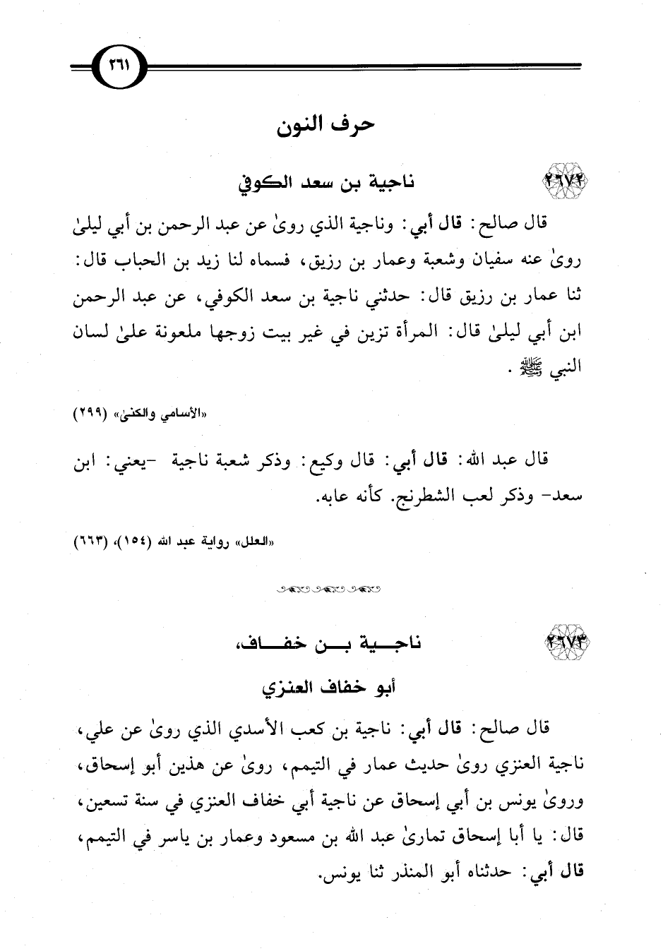 قال صالح: قال أبي: وناجية الذي روى عن عبد الرحمن بن أبي ليلى روى عنه سفيان وشعبة وعمار بن رزيق، فسماه لنا زيد بن الحباب قال: ثنا عمار بن رزيق قال: حدثني ناجية بن سعد الكوفي، عن عبد الرحمن ابن أبي ليلى قال: المرأة تزين في غير بيت زوجها ملعونة على لسان النبي -صلى اللَّه عليه وسلم-