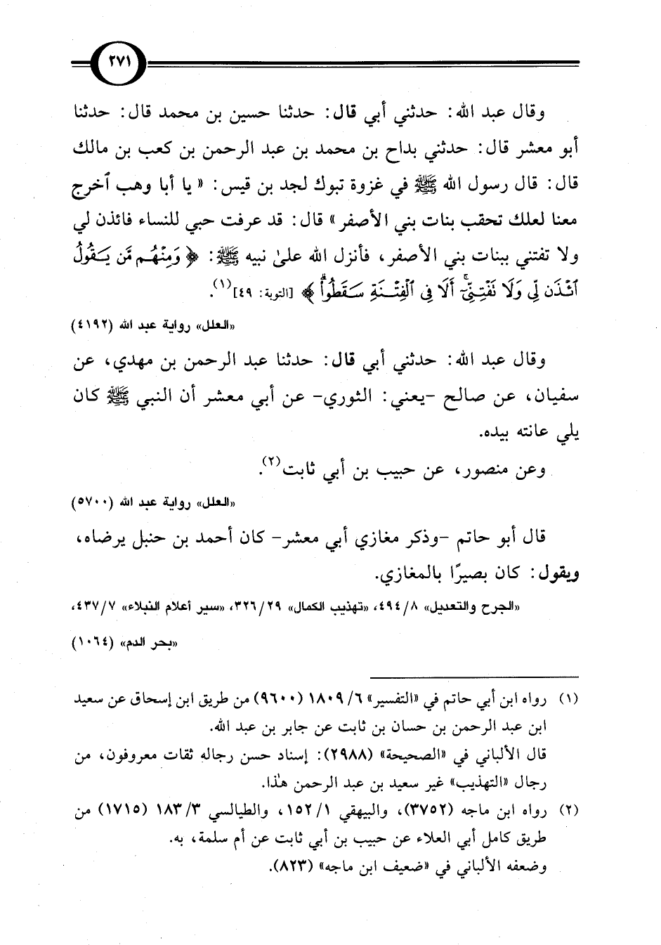 وقال عبد اللَّه: حدثني أبي قال: حدثنا حسين بن محمد قال: حدثنا أبو معشر قال: حدثني بداح بن محمد بن عبد الرحمن بن كعب بن مالك قال: قال رسول اللَّه -صلى اللَّه عليه وسلم- في غزوة تبوك لجد بن قيس: "يا أبا وهب أخرج معنا لعلك تحقب بنات بني الأصفر" قال: قد عرفت حبي للنساء فائذن لي ولا تفتني ببنات بني الأصفر، فأنزل اللَّه على نبيه -صلى اللَّه عليه وسلم-: {وَمِنْهُمْ مَنْ يَقُولُ ائْذَنْ لِي وَلَا تَفْتِنِّي أَلَا فِي الْفِتْنَةِ سَقَطُوا} [التوبة: 49] (¬1).