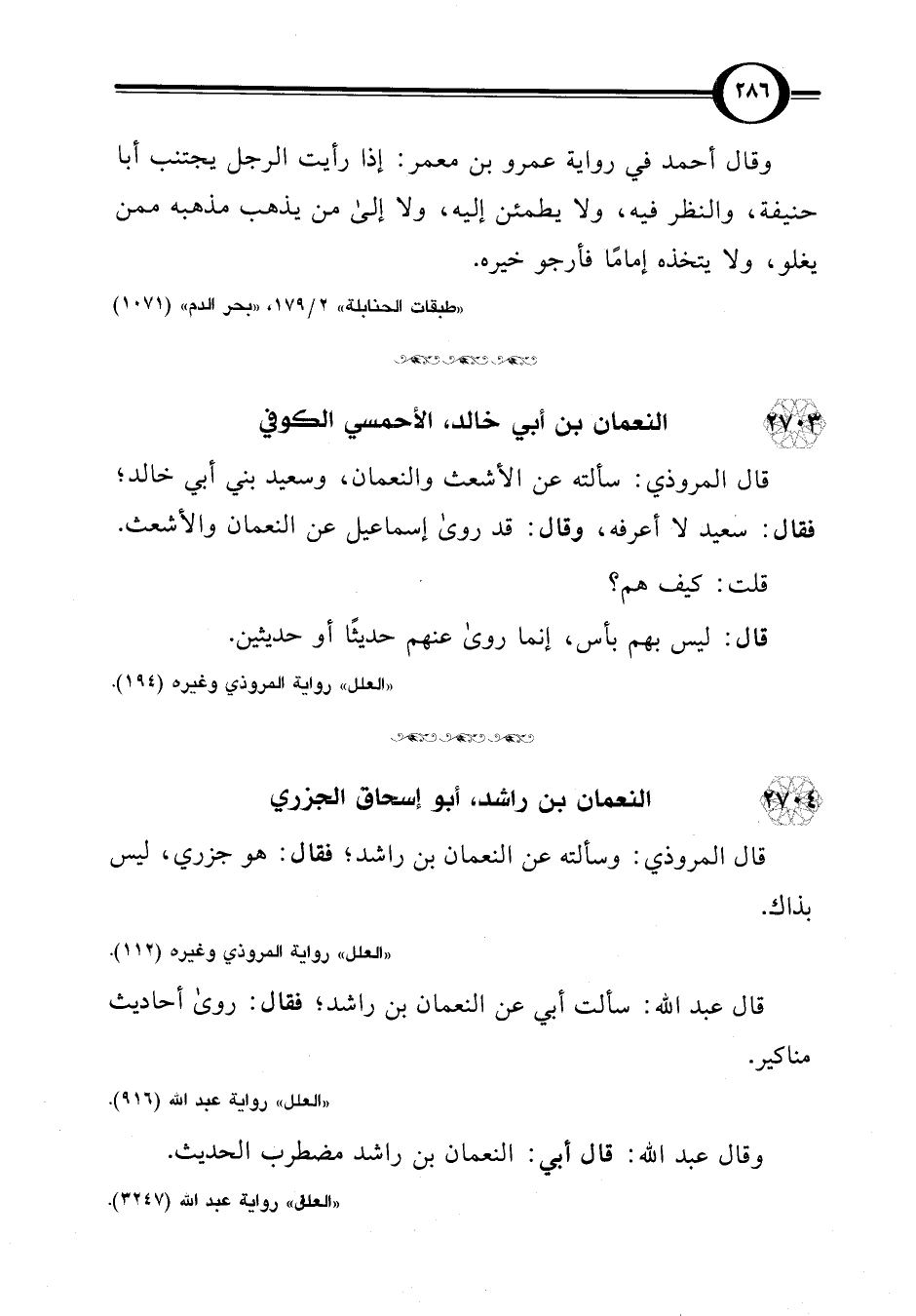 قال المروذي: وسألته عن النعمان بن راشد؛ فقال: هو جزري، ليس بذاك.