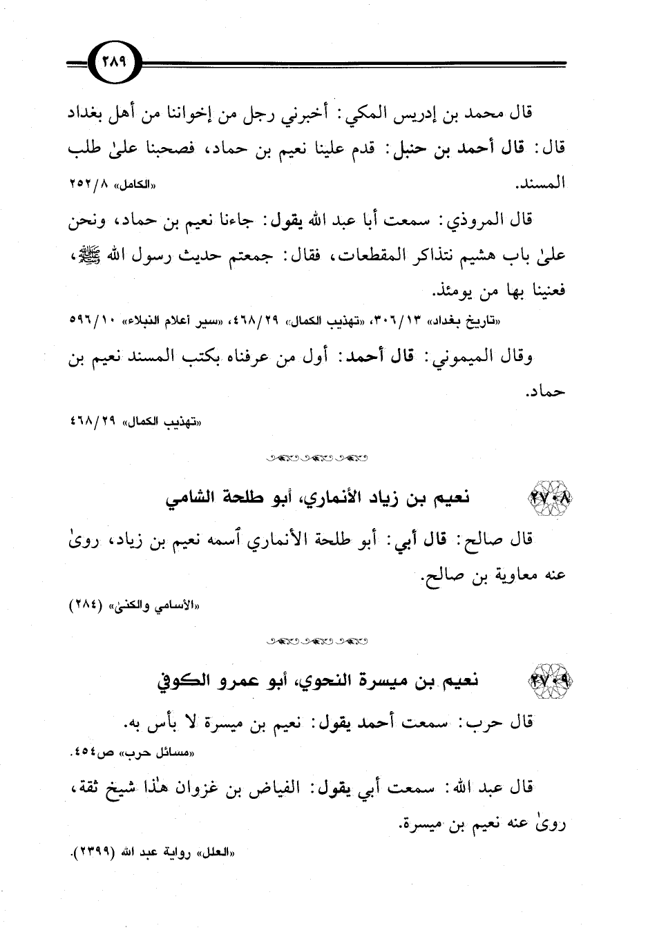 قال محمد بن إدريس المكي: أخبرني رجل من إخواننا من أهل بغداد قال: قال أحمد بن حنبل: قدم علينا نعيم بن حماد، فصحبنا على طلب المسند.