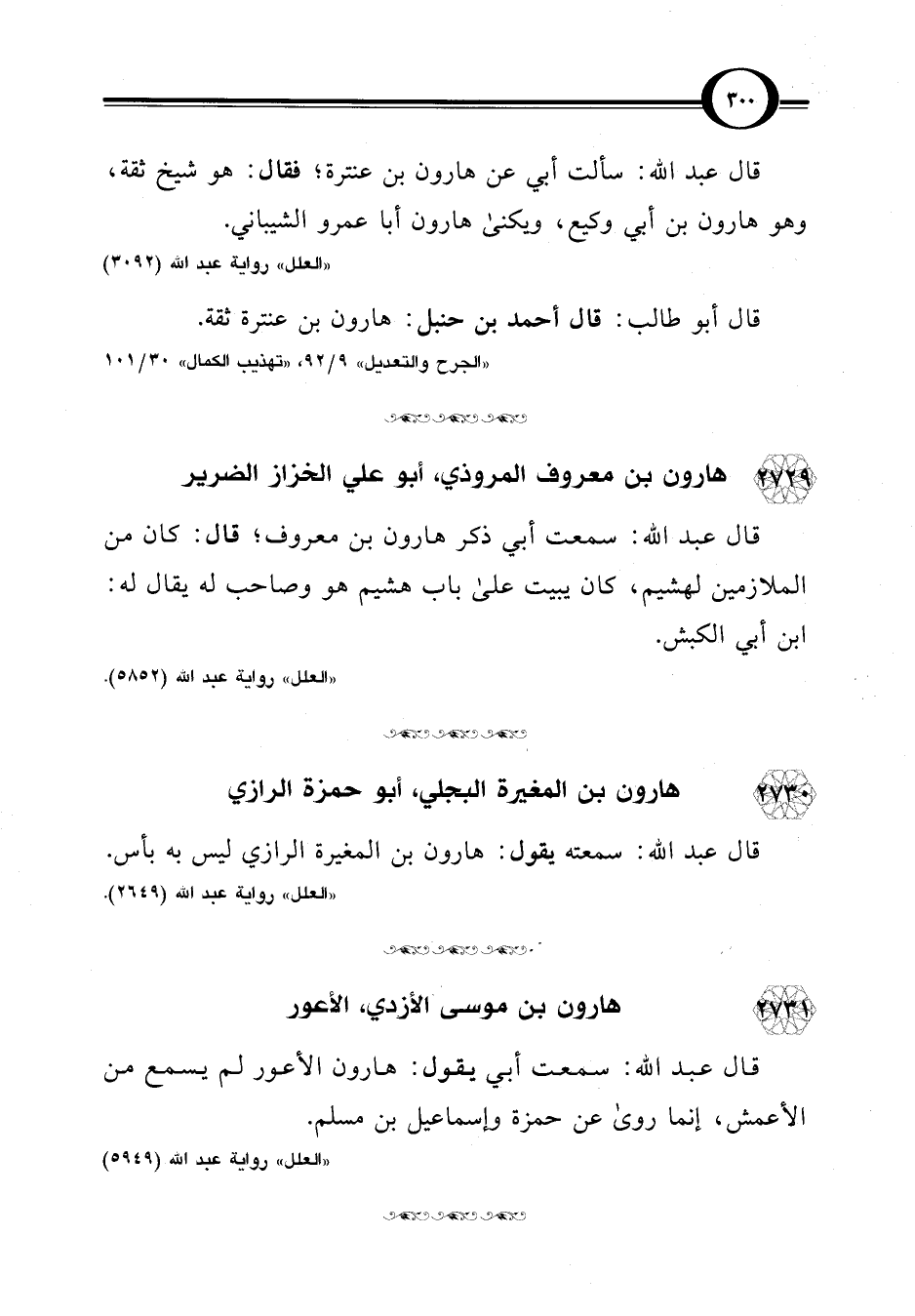 قال عبد اللَّه: سمعت أبي يقول: هارون الأعور لم يسمع من الأعمش، إنما روى عن حمزة وإسماعيل بن مسلم.
