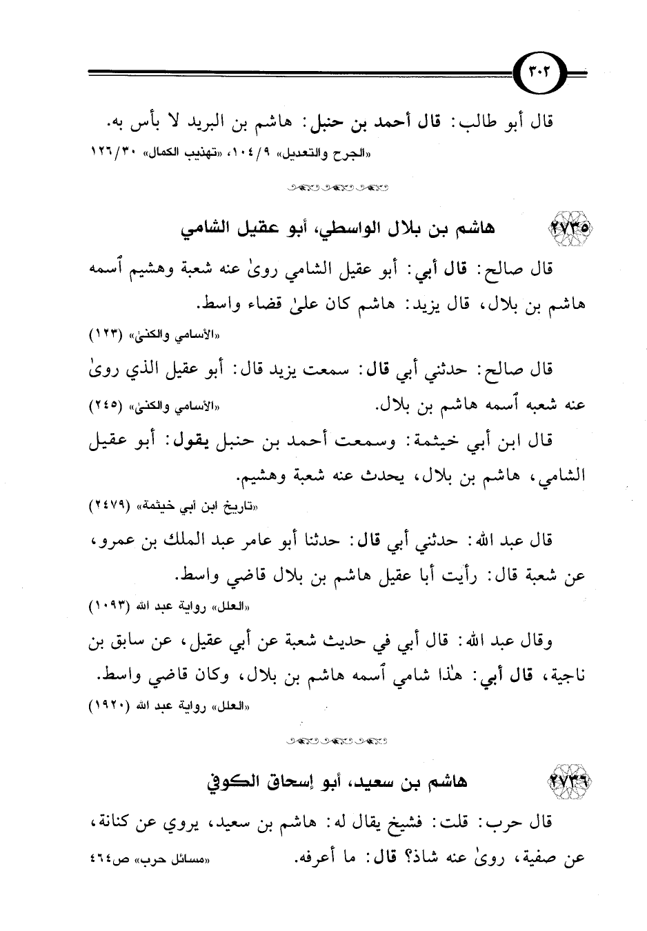 وقال عبد اللَّه: قال أبي في حديث شعبة عن أبي عقيل، عن سابق بن ناجية، قال أبي: هذا شامي اسمه هاشم بن بلال، وكان قاضي واسط.