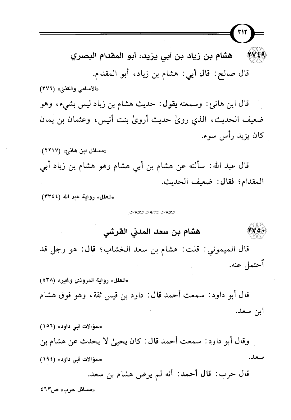 قال ابن هانئ: وسمعته يقول: حديث هشام بن زياد ليس بشيء، وهو ضعيف الحديث، الذي روى حديث أروى بنت أنيس، وعثمان بن يمان كان يزيد رأس سوء.